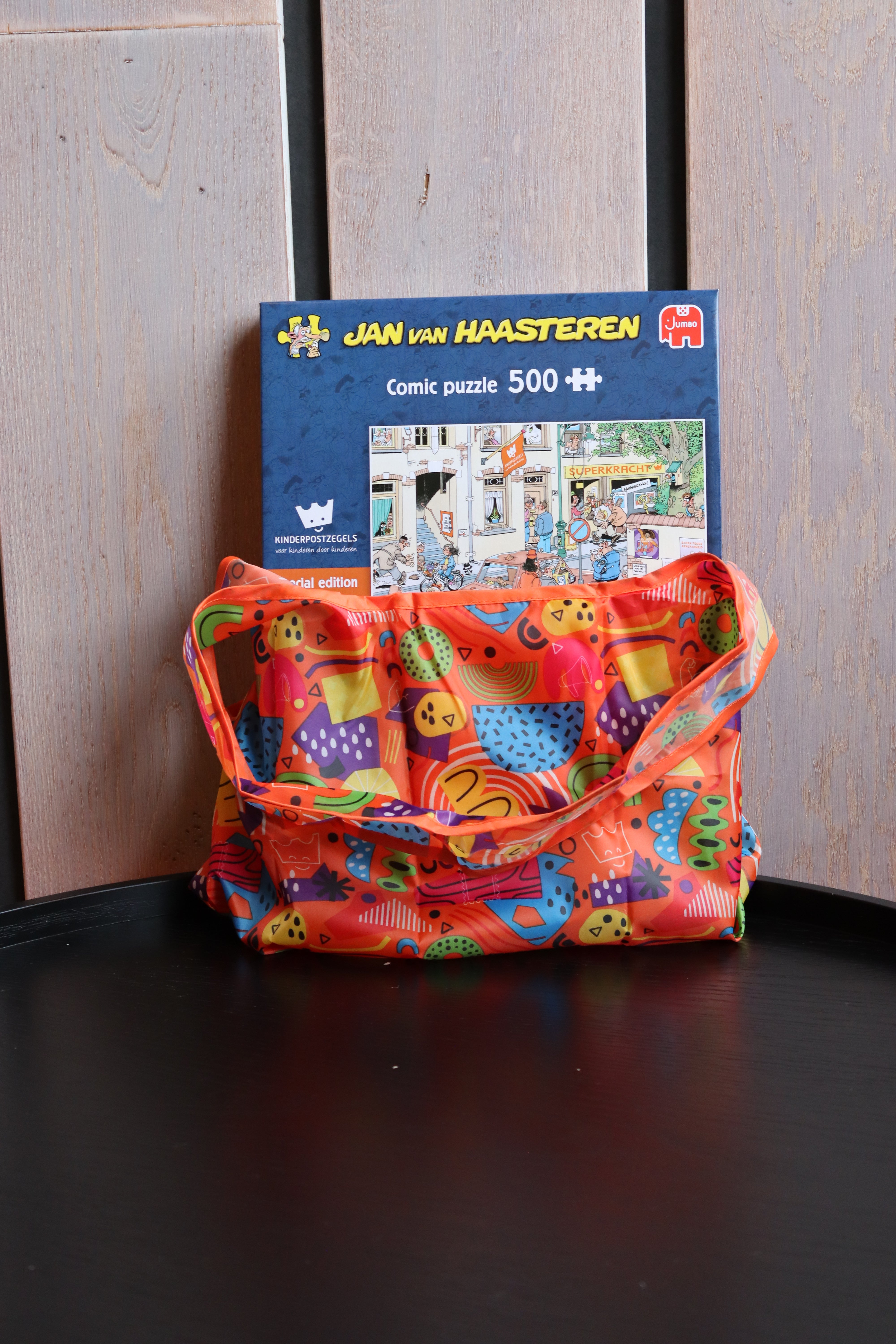 Leuk om cadeau te doen óf om zelf te houden: een handige vouwtas én de special edition Jan van Haasteren puzzel. Jan van Haasteren maakte de afbeelding exclusief voor Kinderpostzegels. De puzzel bestaat uit 500 stukjes en heeft een afmeting van 35 x 49 cm.